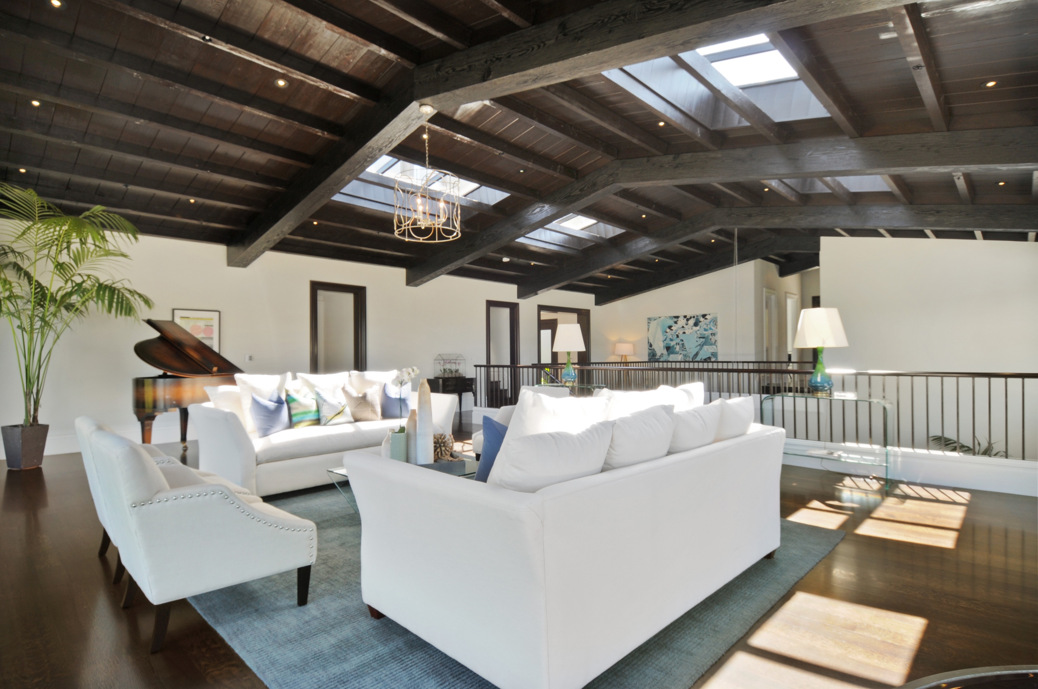 The upper living room offers a warm reception to guests and can accommodate large gatherings.