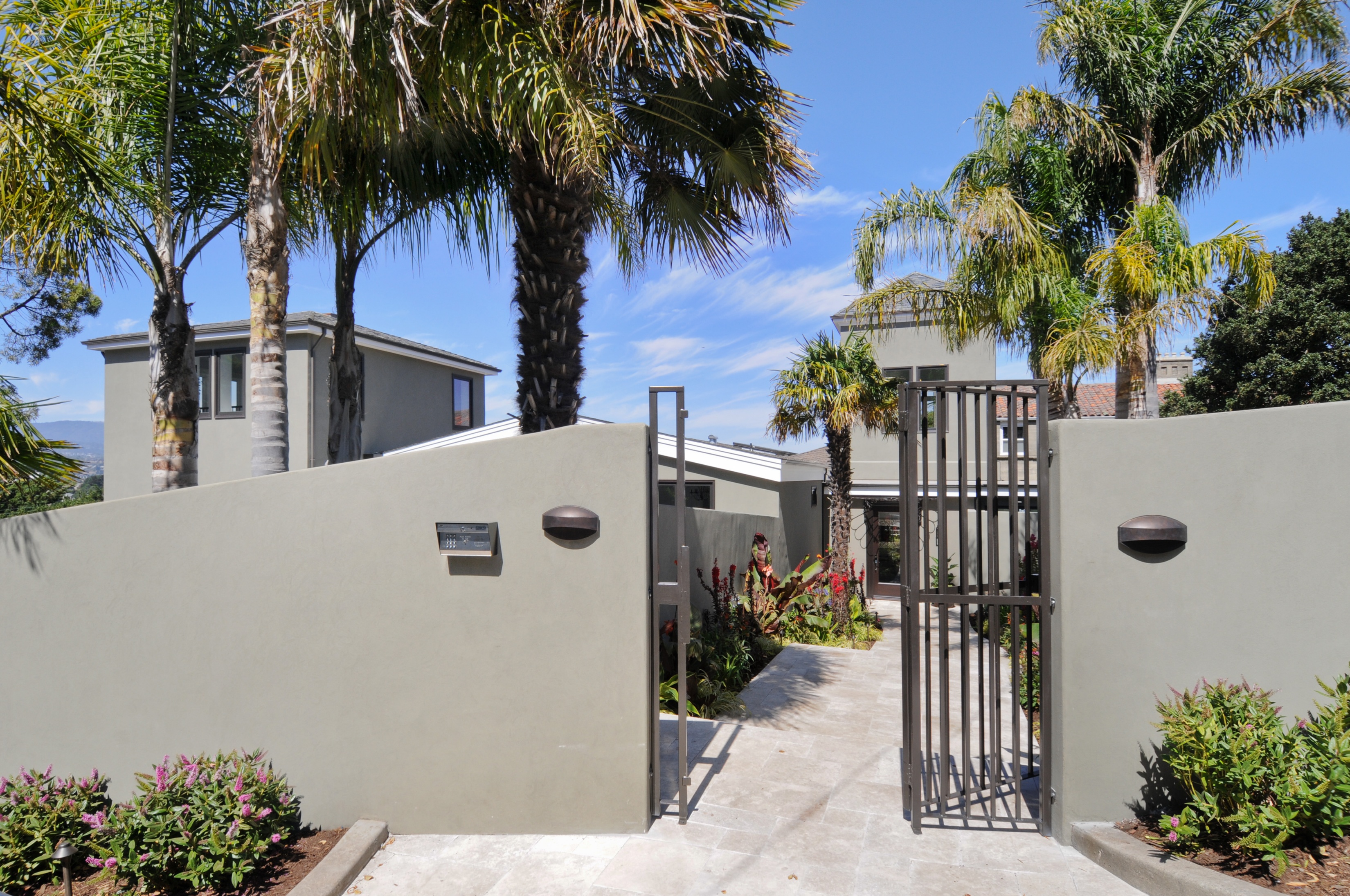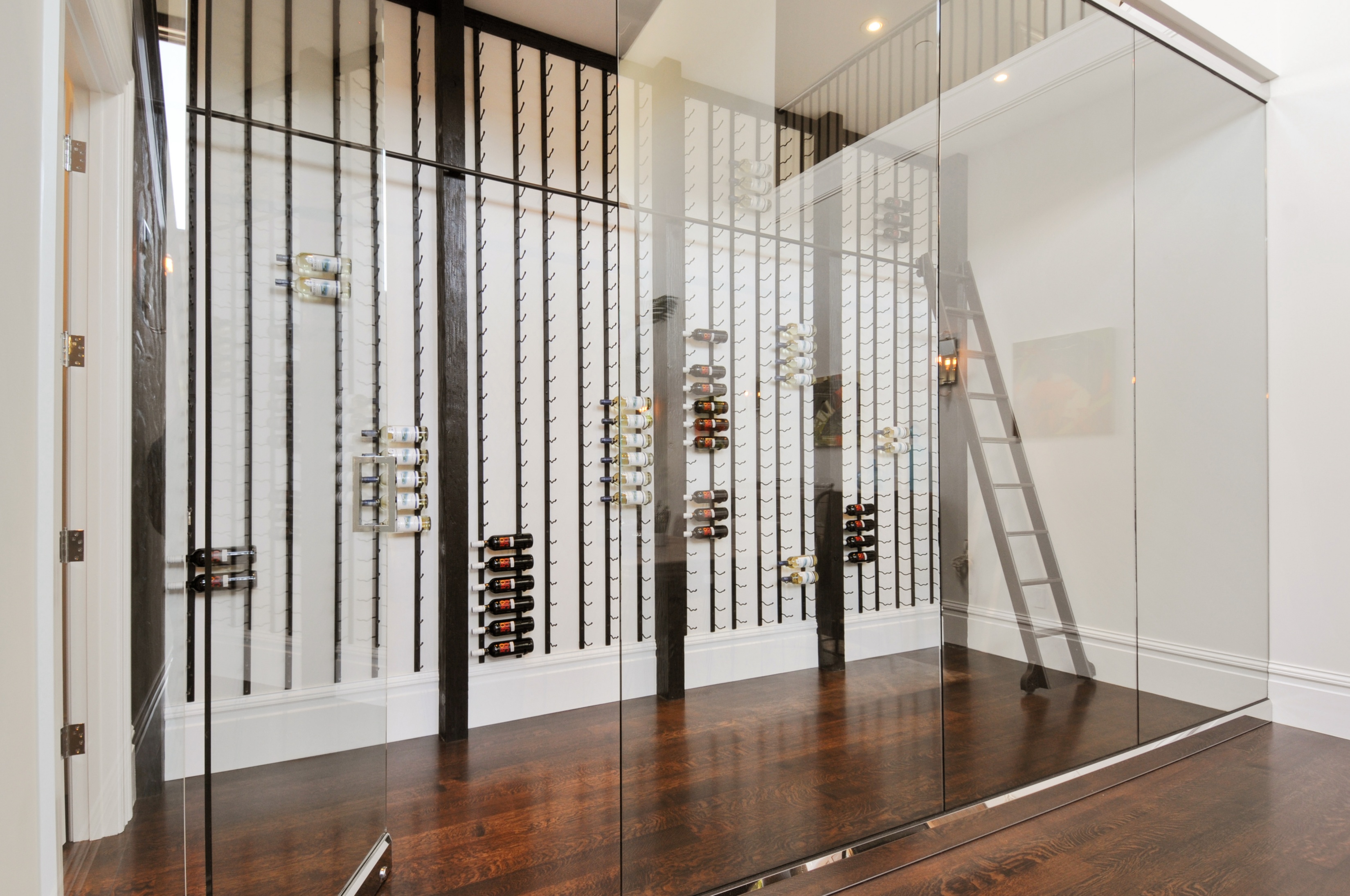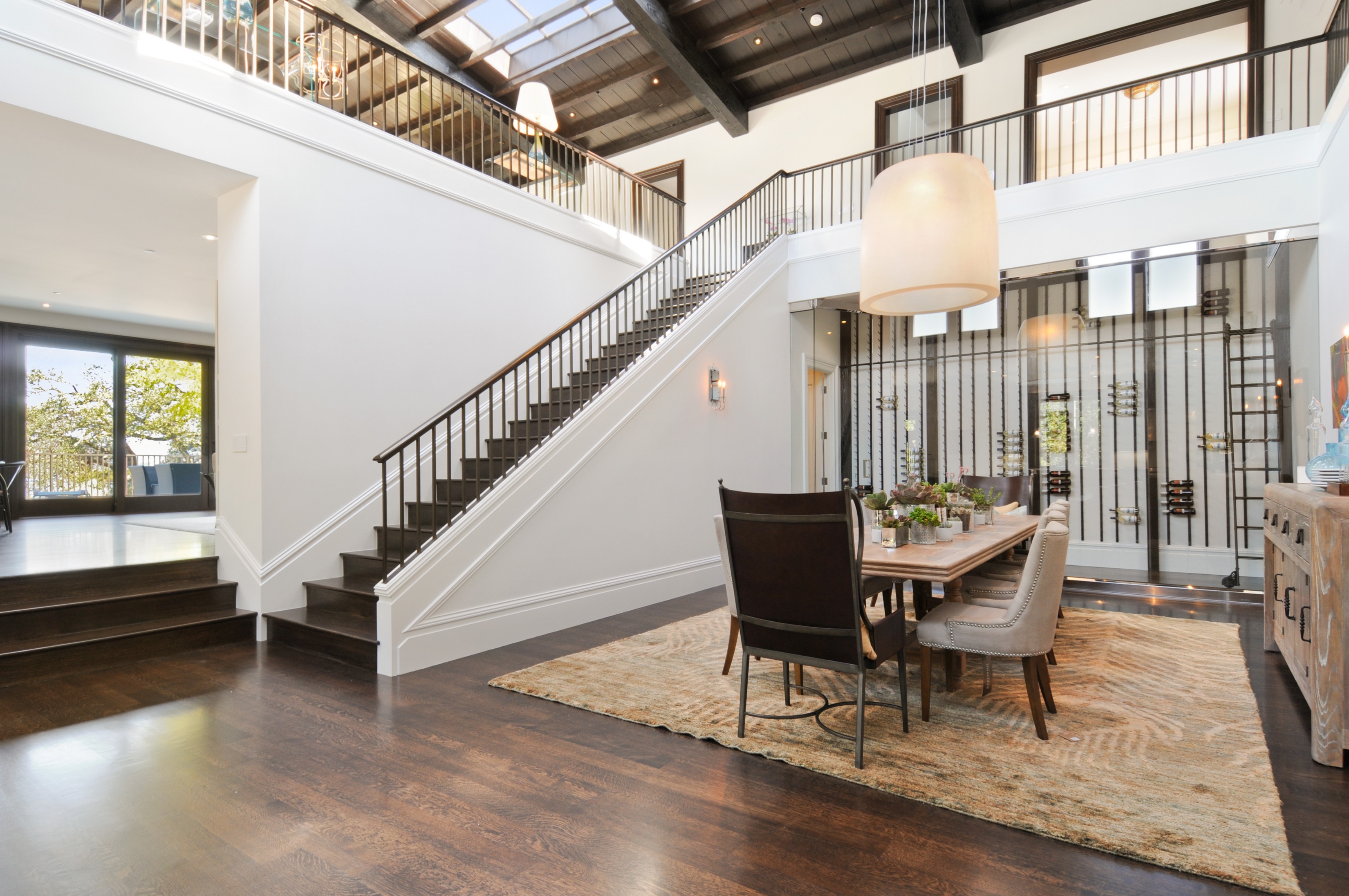 Adjacent to the kitchen is a spacious dining room and glass-fronted wine room. The living room is nearby, as well as a library with built-in bookcases and the private, two-story master suite.