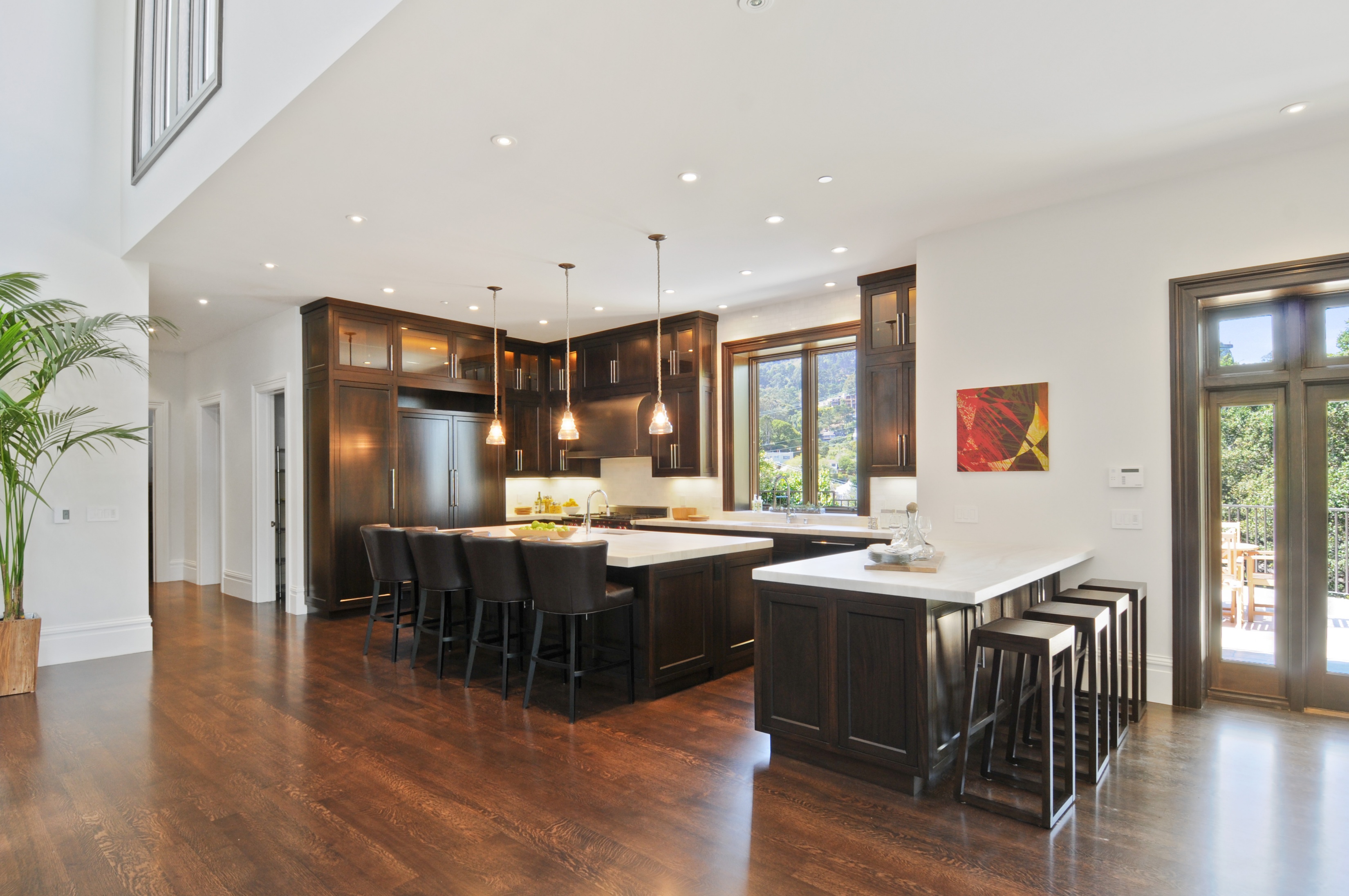 The main level features an impressive chef’s kitchen with custom cabinetry, Sub-Zero refrigerator and freezer, Miele dishwasher, and Wolf range.