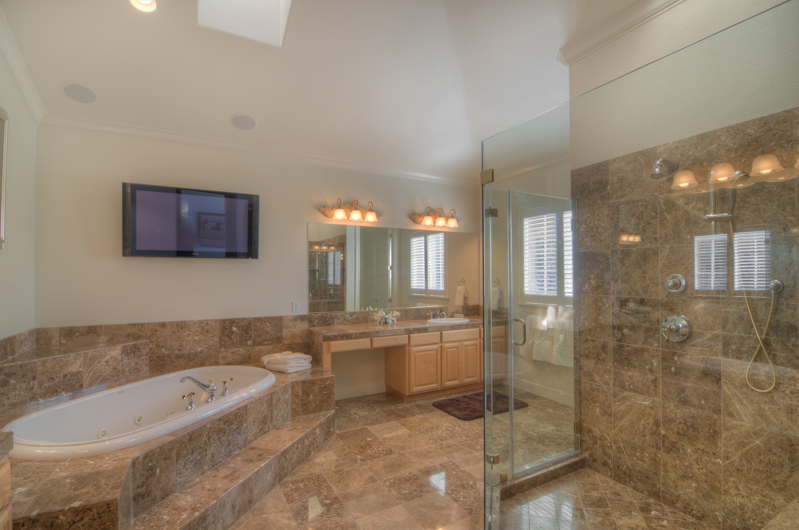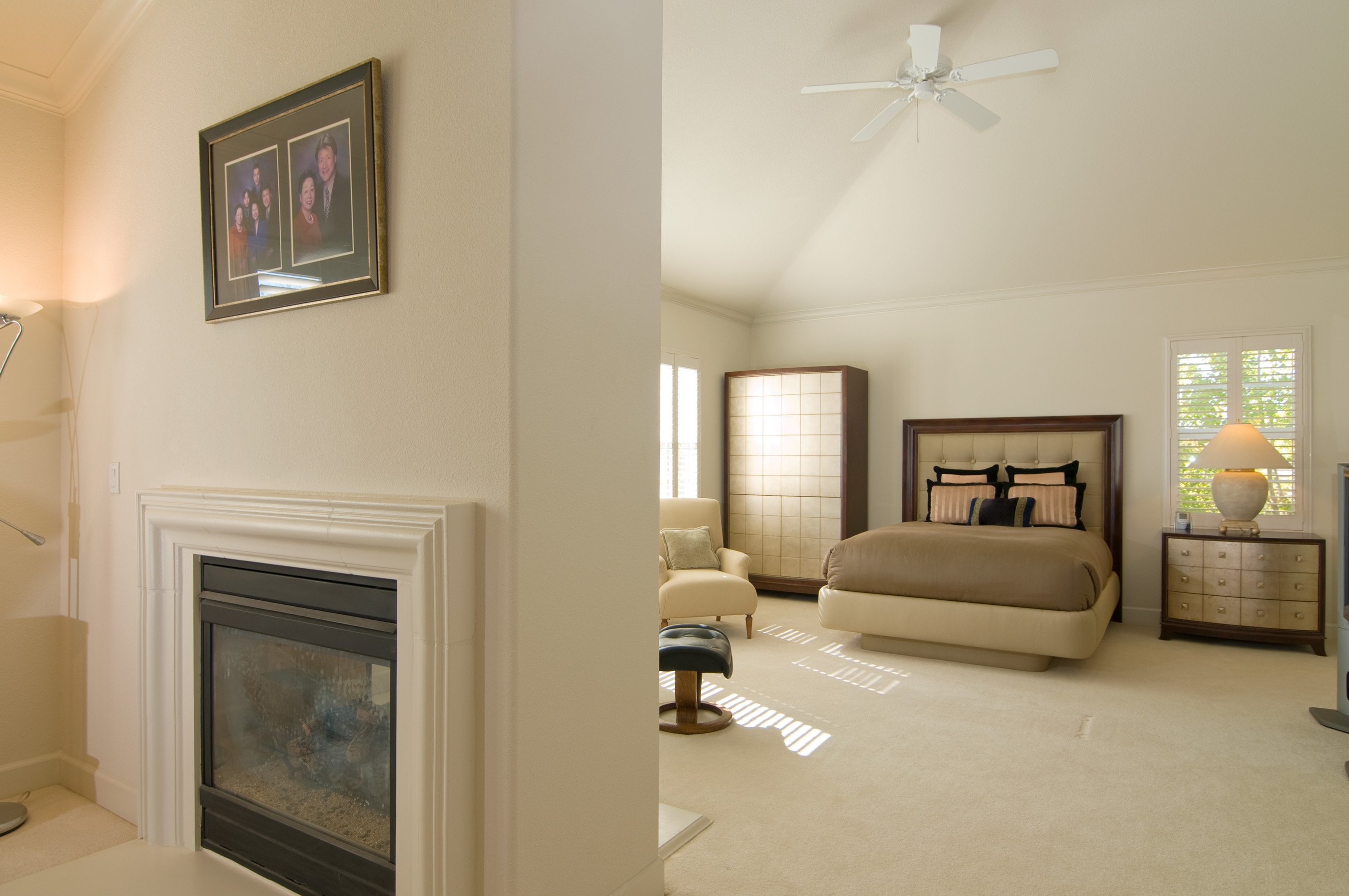 A spacious master suite boasts its own fireplace, a bathroom with top-of-the-line amenities, and a separate retreat.