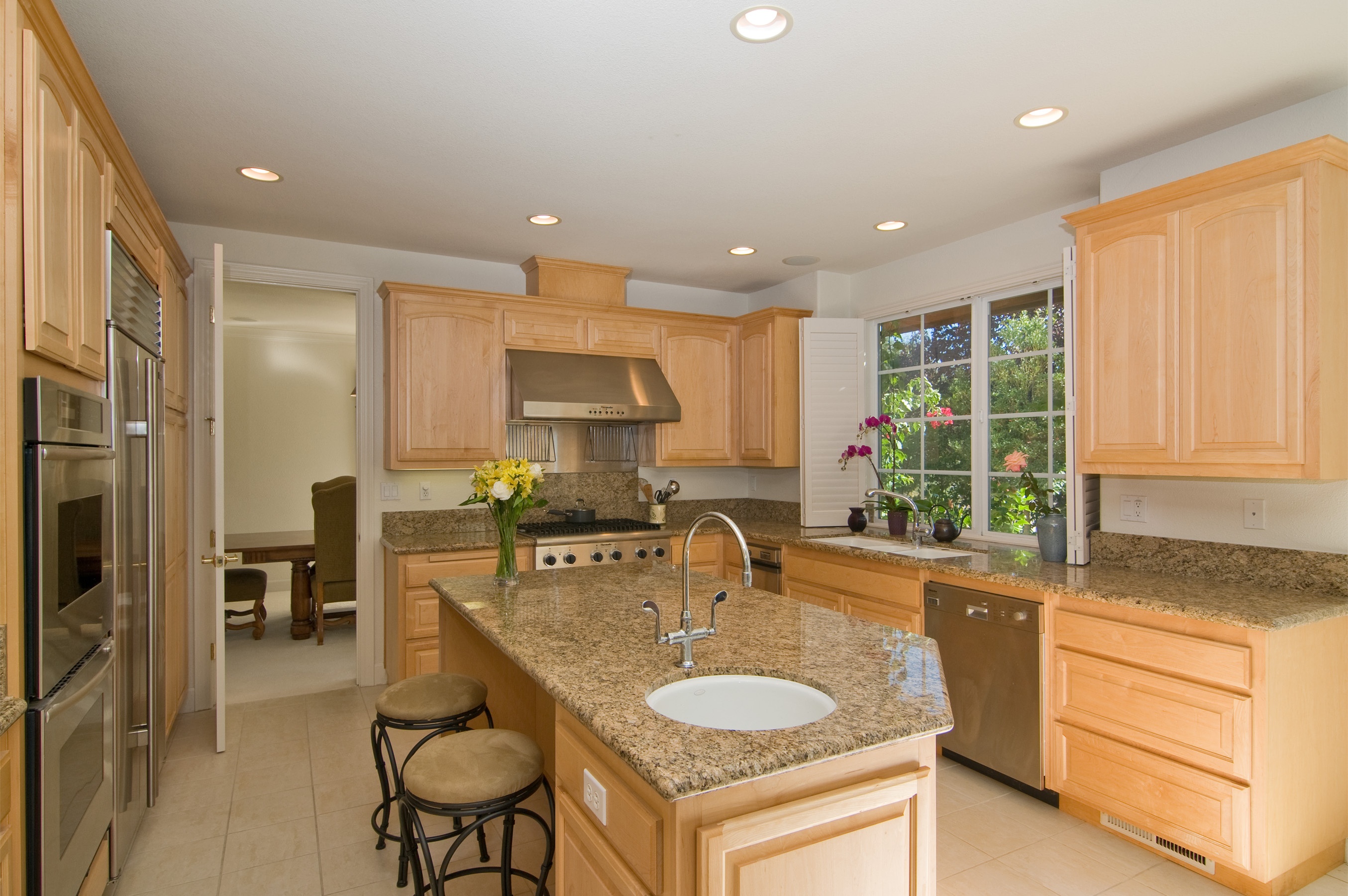 The gourmet kitchen has granite counters, stainless steel appliances, a walk-in pantry, an island with a prep sink, and a breakfast bar.