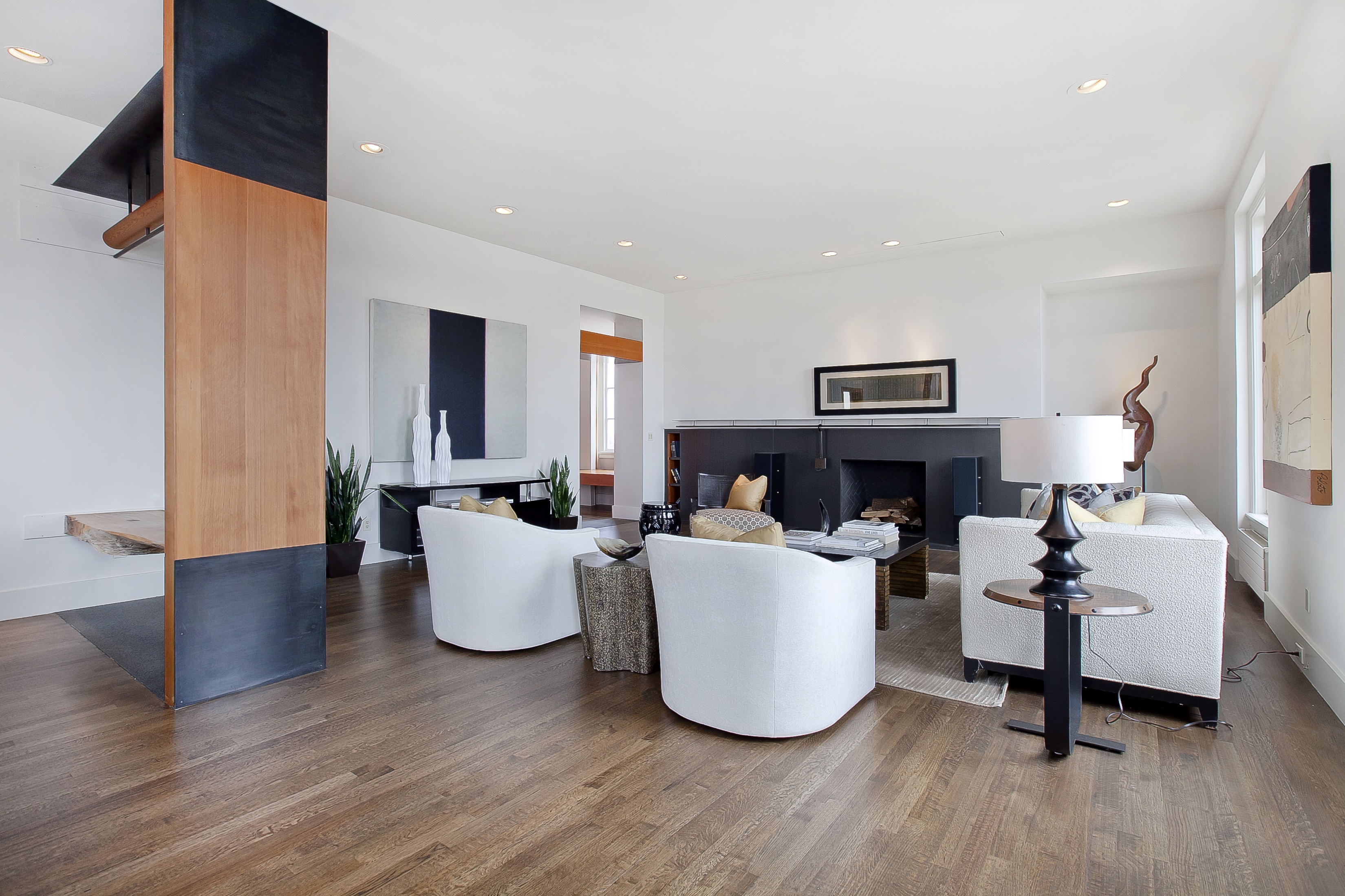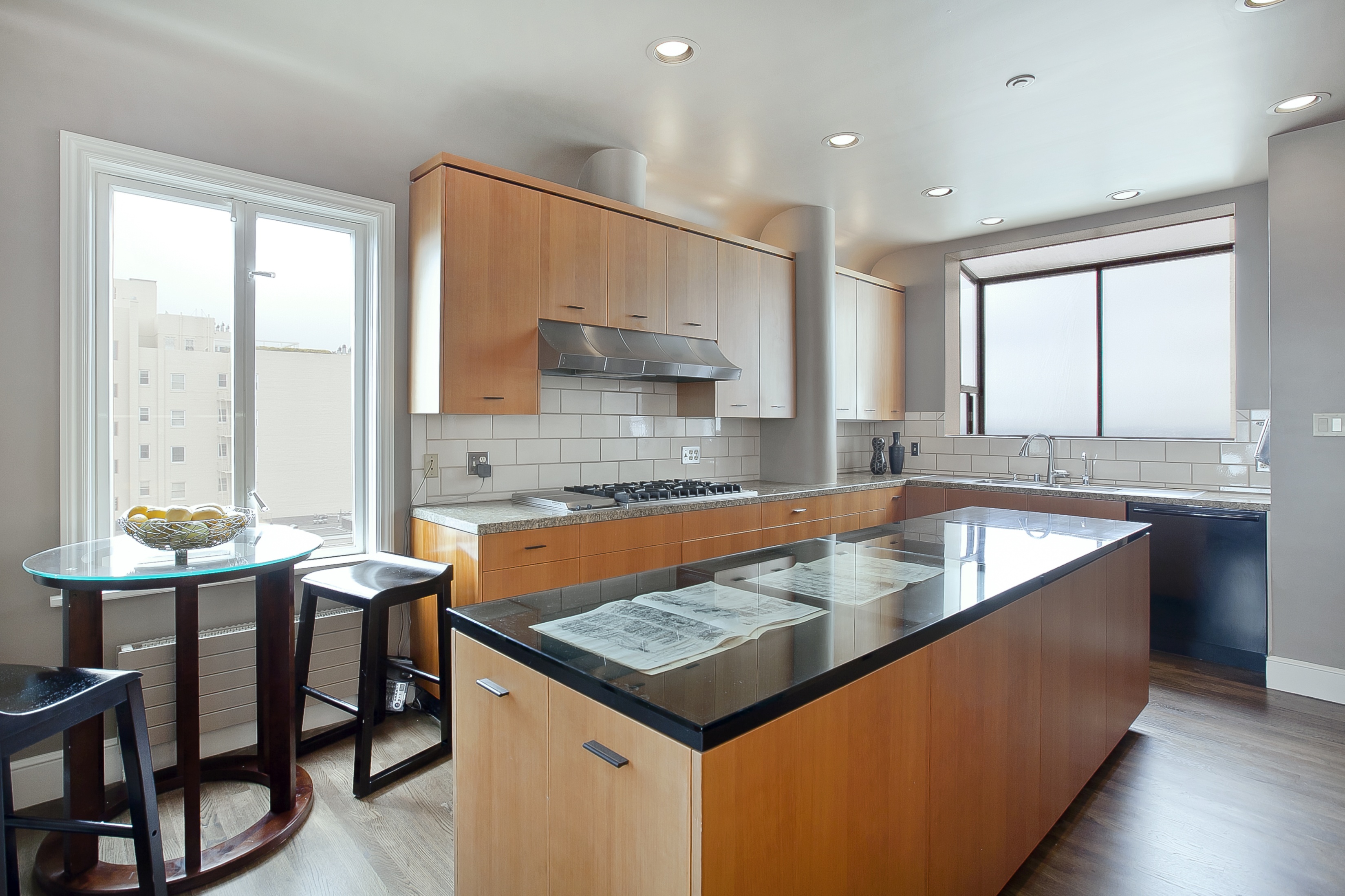 The dramatic penthouse on the upper level is ideal for entertaining, with its spectacular views of the Bay, second kitchen, half bath, and private terrace.