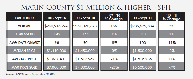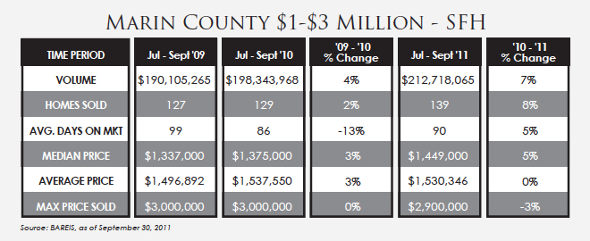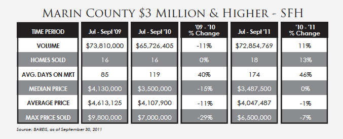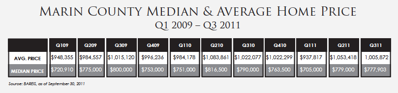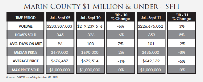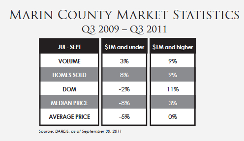 Reflecting back to market conditions of Q3 ‘09 and Q3 ’10, the Q3 ’11 homes sold, average and median prices have remained fairly stable at +/- 10% changes (see chart below). In general, Marin County real estate market conditions are well off the pricing and homes sold from ’06 through the first half of ’08, but buyers with a five plus year investment perspective are seizing attractive opportunities in the market every day.