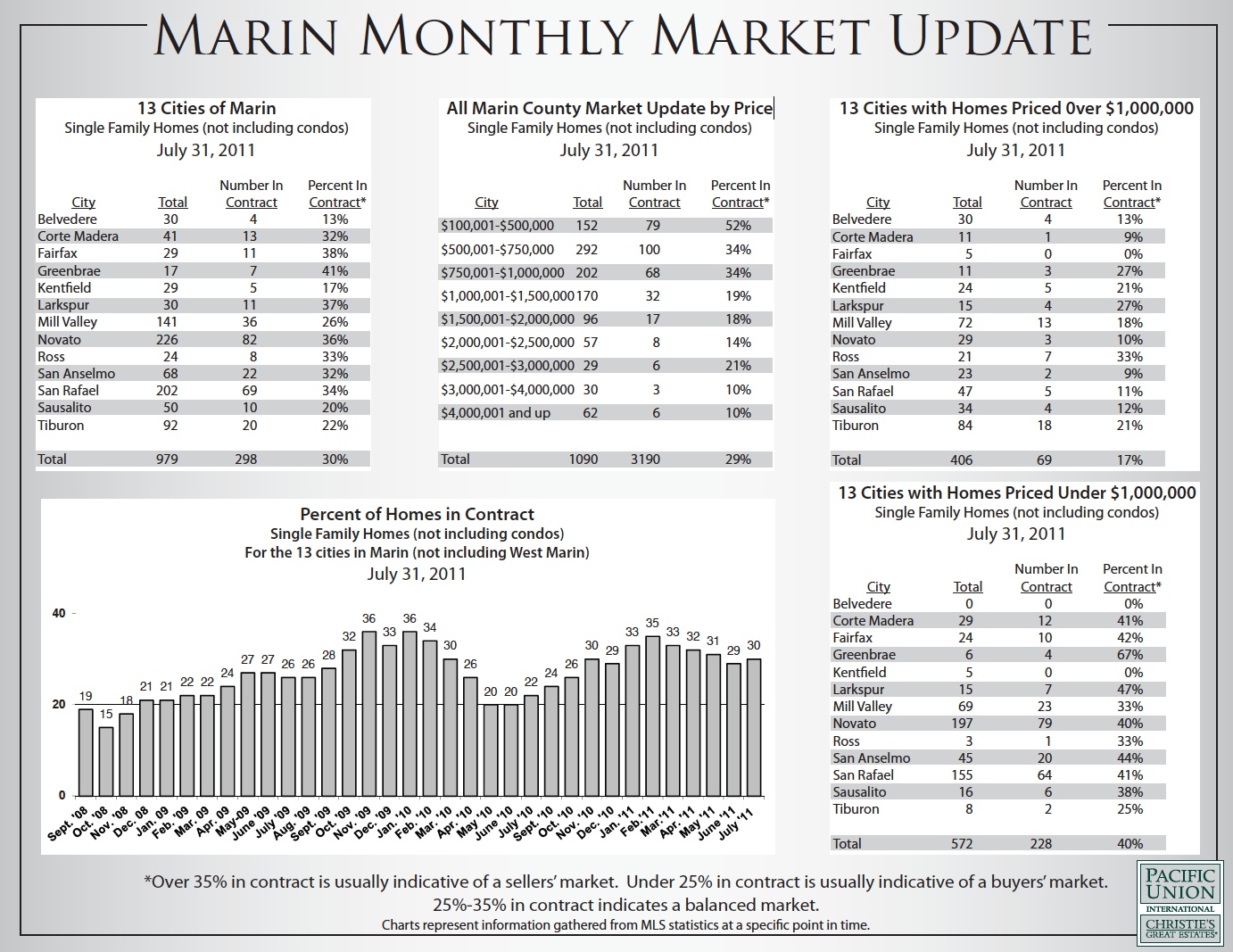 As of the end of July 2011, the percent of homes in Marin priced under $1,000,000 in contract is at 40%, indicating that in this particular area of the Marin housing market it is a seller’s market. And 17% of homes priced over $1,000,000 are in contract. Here we see a buyer’s market.