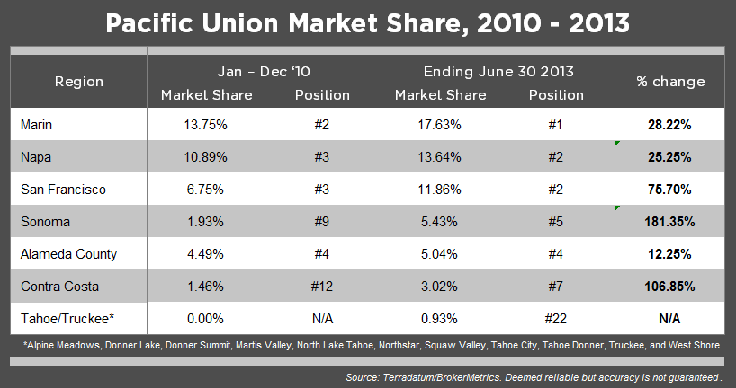 While 2013 has brought industry recognition to both Pacific Union and our team of professionals, the firm has been steadily building momentum over the past four years. In fact, we’ve increased our market share by double-digit percentages in every region where we had a presence in 2010. The growth was most dramatic in Sonoma County, where we increased our market share by an impressive 181 percent. Pacific Union also enjoyed large market-share gains in Contra Costa and San Francisco counties. In terms of market share, we now occupy the top-five list in six of our eight regions (including Sonoma County and Sonoma Valley) and are coming on strong in our newest market, the Tahoe/Truckee area.