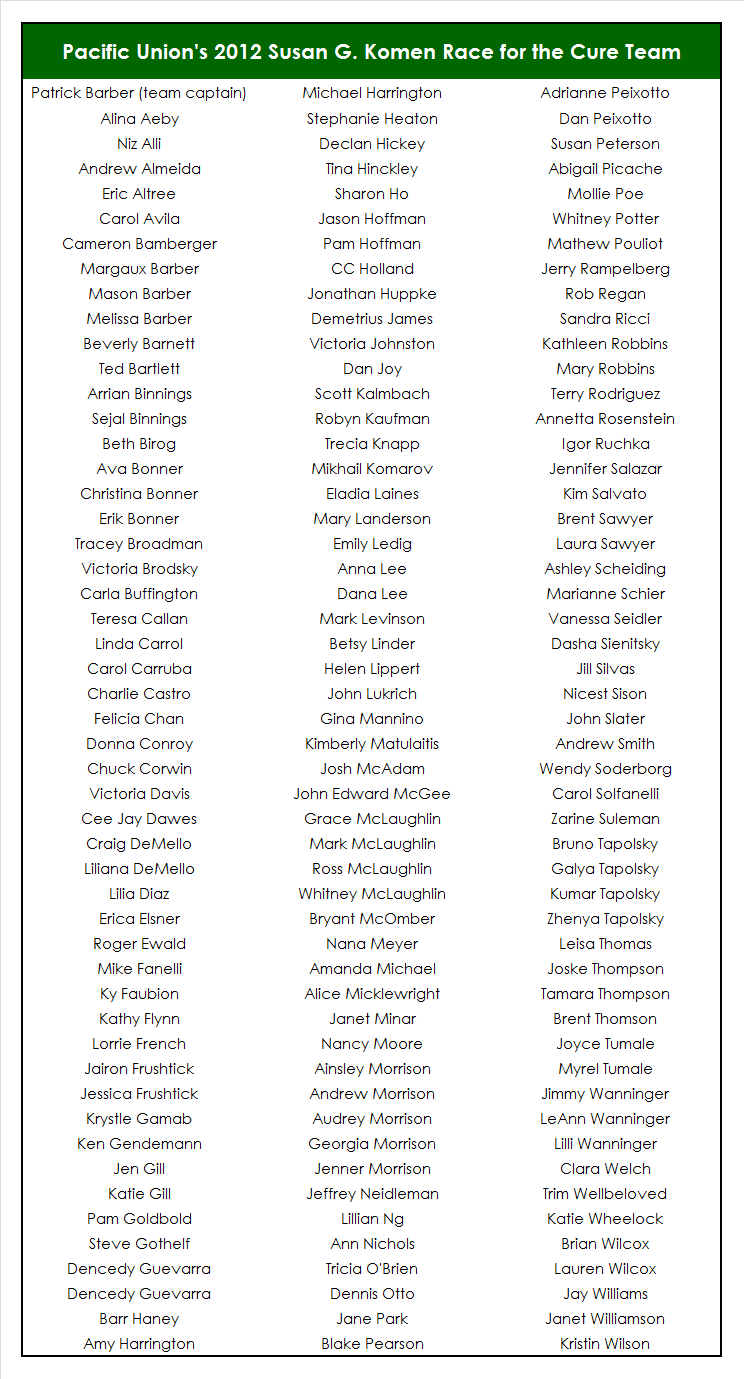 We’d like to congratulate our team on its stellar performance! To see more photos of our team in action, please visit our Facebook page. And for anyone who’s interested, there’s still time to donate at Pacific Union’s official Race for the Cure page.